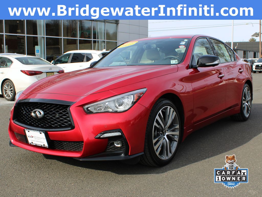 Check out this excellent condition Dynamic Sunstone Red 2023 INFINITI Q50 SENSORY AWD AWD 7-Speed Automatic with Overdrive 19/27 City/Highway MPG 3.0L V6. This INFINITI Q50 SENSORY AWD is well equipped and includes these features and benefits: Navigation system: INFINITI InTouch Navigation, Leather interior, Bluetooth, Power Windows, Power Door Locks, Infiniti Keyless entry and has successfully undergone a rigorous pre-buy inspection. * 2023 IIHS Top Safety Pick * Upscale and spacious interior; priced lower than many rivals; high fuel economy; generous trunk space; useful infotainment features. You can save over thousands of dollars, and have better warranty with Infiniti Certified Pre-owned.